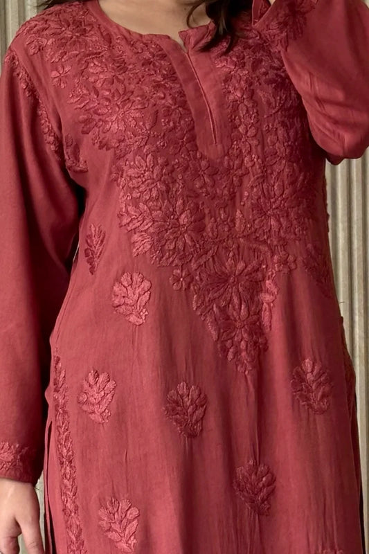 Dniza Handmade Rust Orange Floral Chikankari Kurti