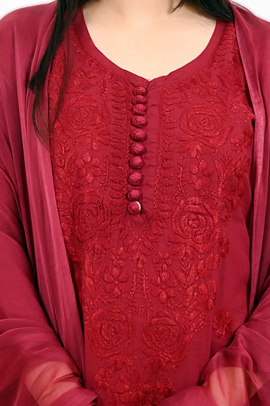 Deep Wine Red Cotton Malmal 3 Piece Set