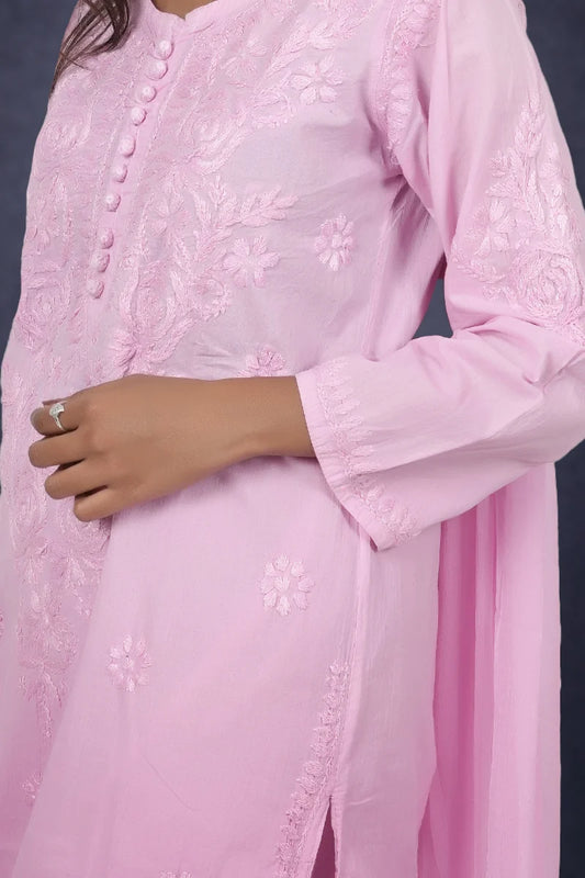 Dniza Pink Chikankari 3pc Set – Traditional Kurti, Pants & Dupatta