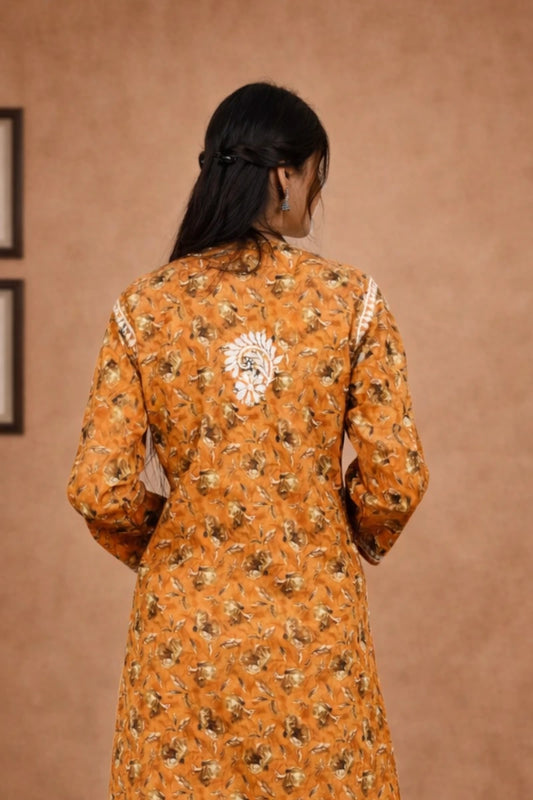 Golden Mustard Floral Handblock Malmal Cotton Kurti