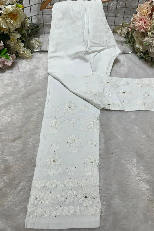 Pearl Petal – White Cotton Tulip Pant with Embroidered Elegance (Free Size)