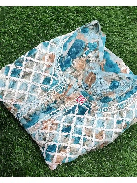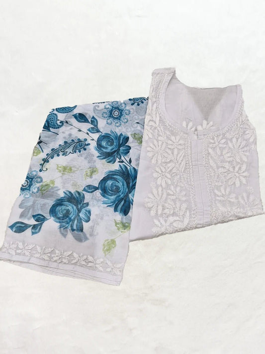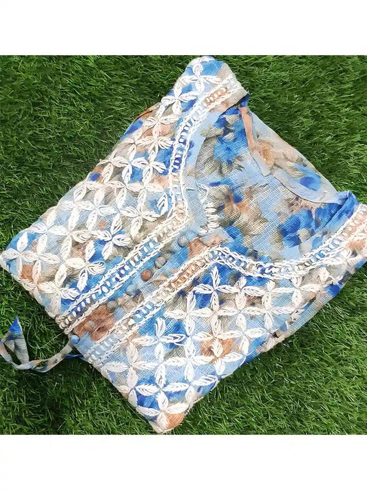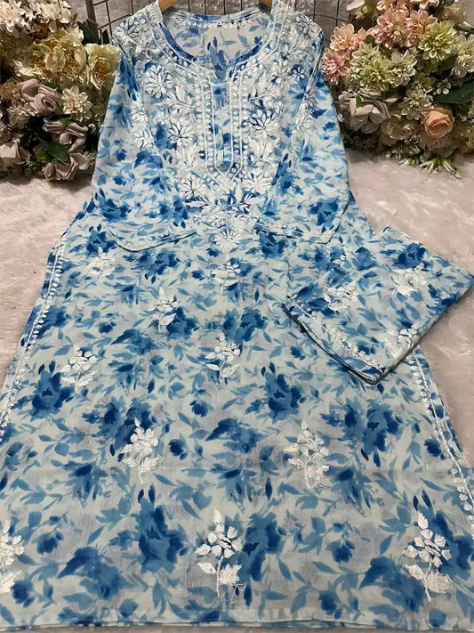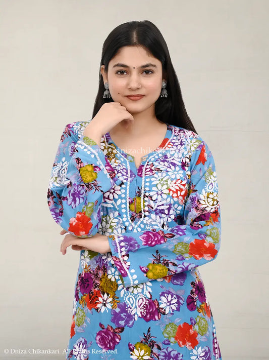 Ocean Bloom – Sky Blue Floral Long Kurti with White Embroidery