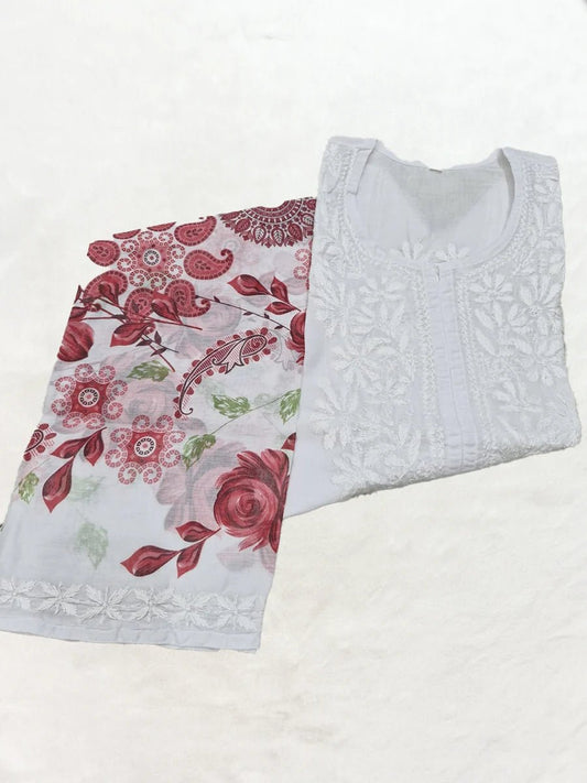 Ivory Bloom – Red Floral Long Kurti with White Ghas Patti Embroidery