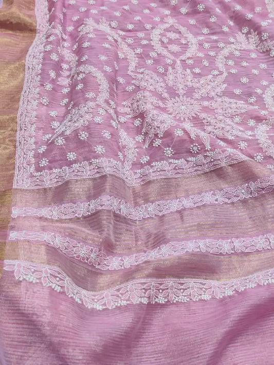 Rani Glow – Sweety Pink Chanderi Chikankari Saree with Golden Border Detail