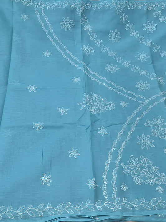 Teal Blue Cotton Saree with Traditional Shadow Embroidery