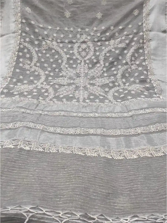 Moonlight Grey – Elegant Steel Grey Chanderi Saree with Hand Chikankari