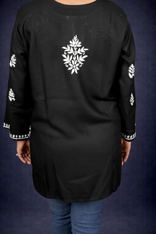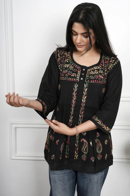 Midnight Black Multicolor Embroidered Chikankari Short Kurti