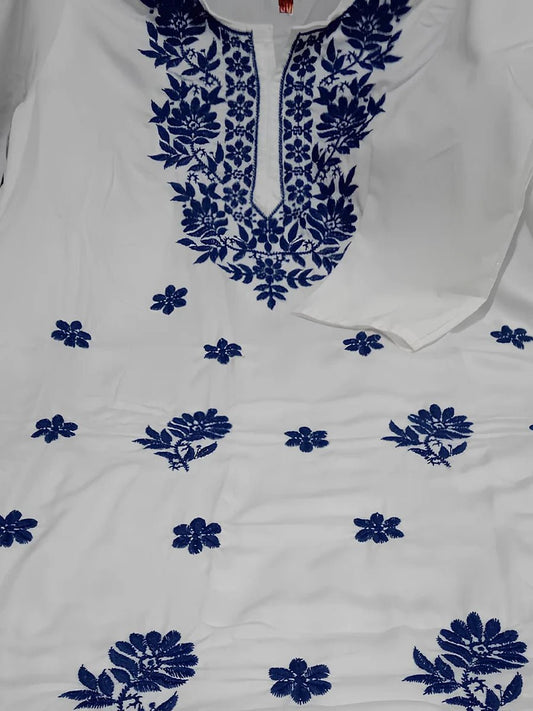 Indigo Bloom – Rayon White Kurti with Blue Floral Embroidery