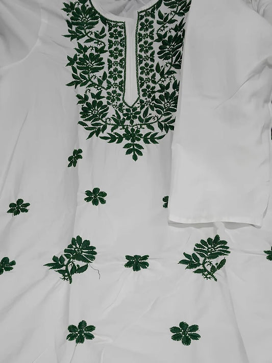 Meadow Green – White Rayon Kurti with Elegant Green Thread Work