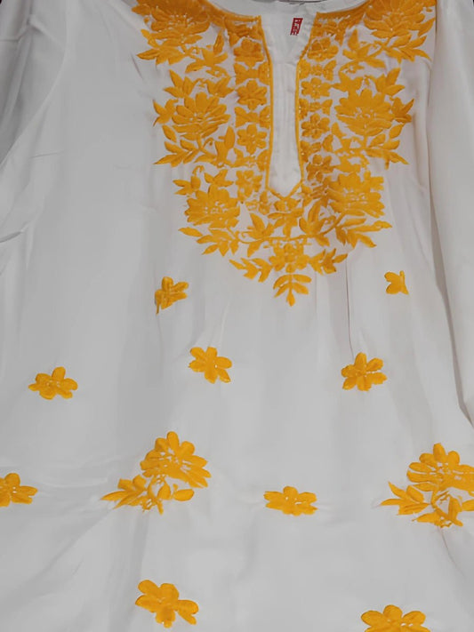 Sunlit Bloom – White Rayon Kurti with Vibrant Mustard Embroidery